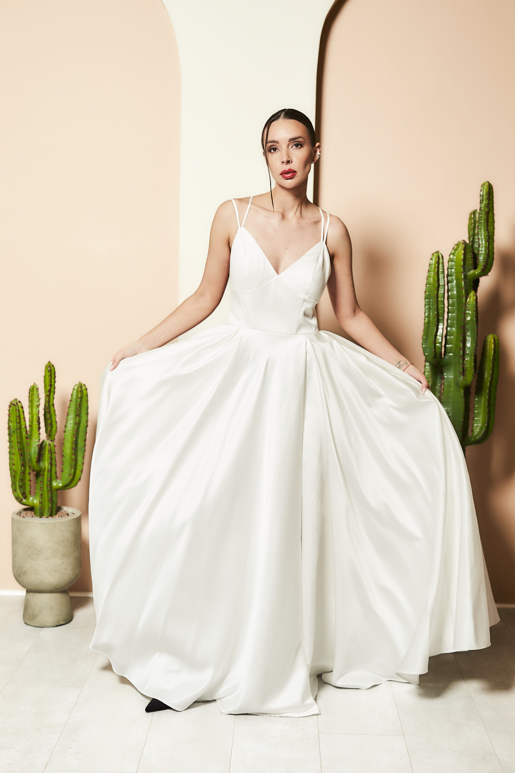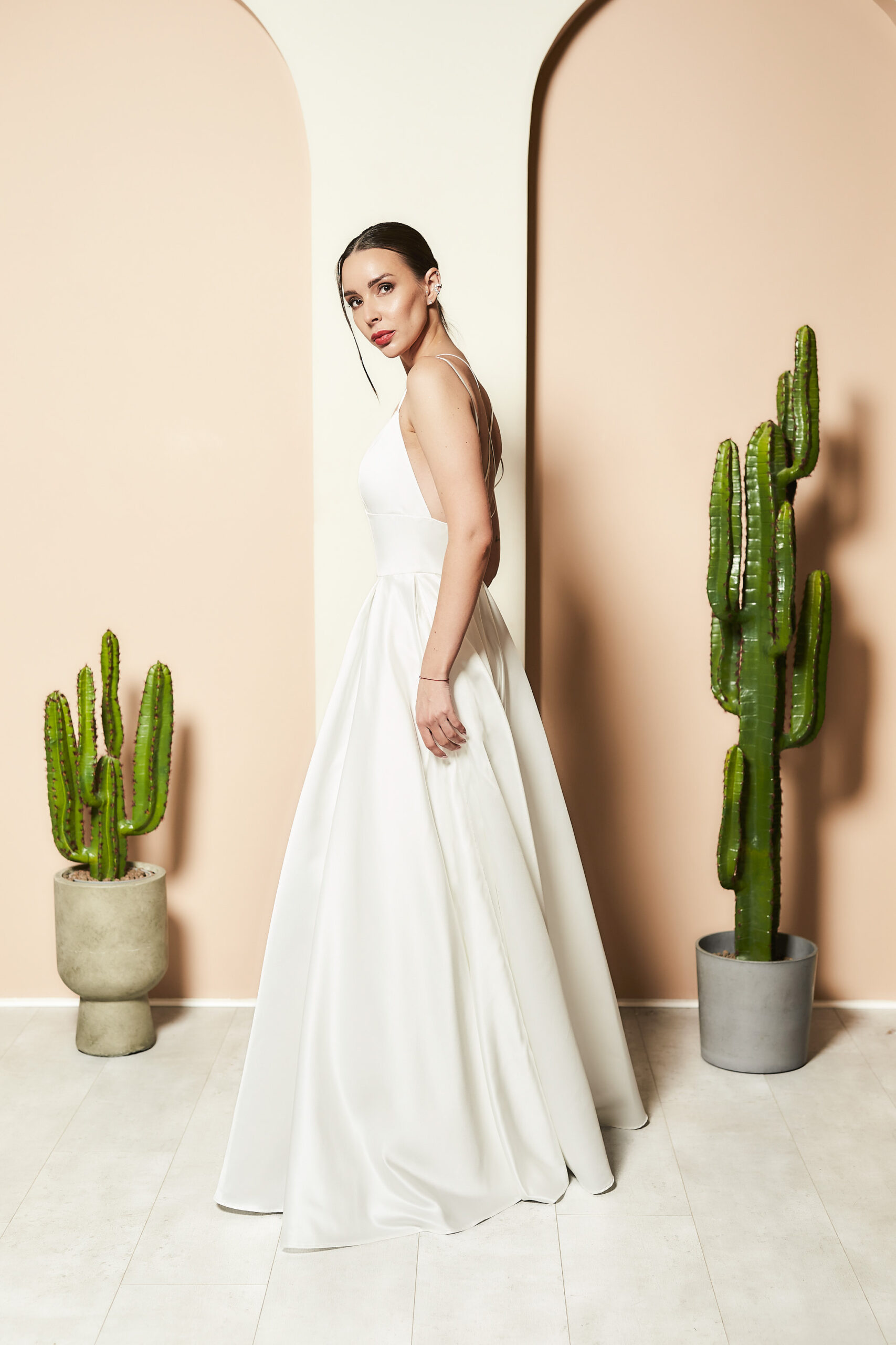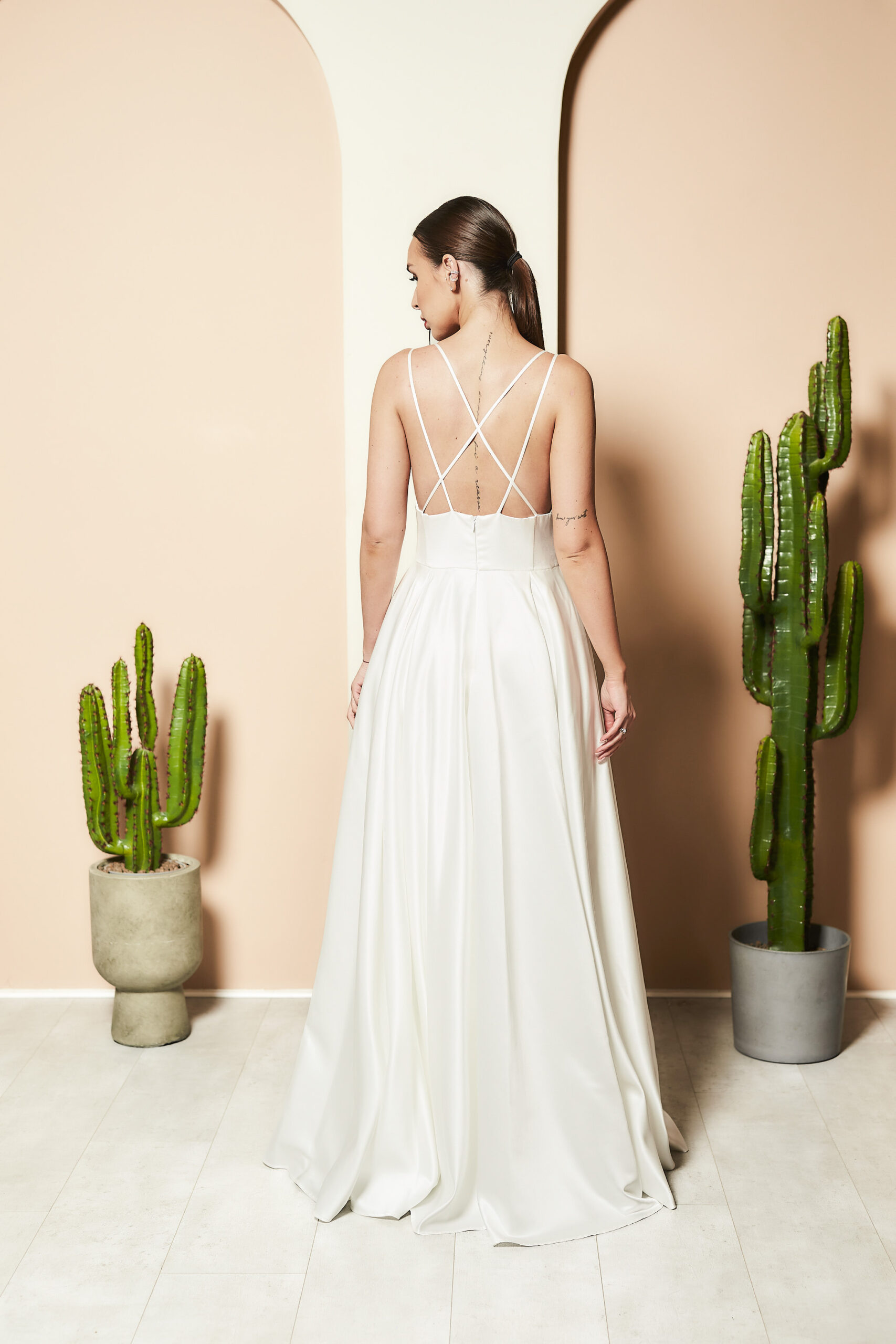 SUKEINKA ŚLUBNA o kształcie klasycznym , idealna na sezon wiosna lato jako sukienka ślubna . Skład wiskowa 80% jedwab 20%